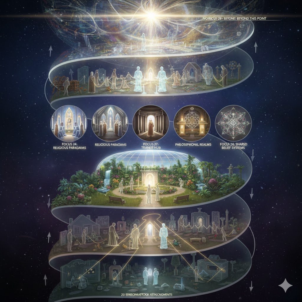포커스 24에서 26까지의 영역은 ‘신념 체계 영토(Belief System Territories)’라 불립니다. 이곳은 비물질적 존재로 전이된 인간들이 생전에 가졌던 종교적, 철학적 전제와 개념들을 바탕으로 형성된 공간입니다.